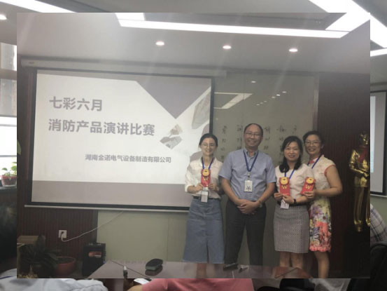 2018年6月30日上午,湖南金諾電氣設備制造有限公司“七彩六月”多主題內訓比賽在總公司會議一室成功舉行。本次比賽由湖南金諾電氣綜合部主辦,銷售部和財務部協辦,經過初賽的選拔后,共有六名優秀選手進入本次比賽。本次比賽活動的評委主要有:湖南金諾電氣公司的董事長、總經理、副總經理、技術總工、工程部部長。比賽主題涵蓋金諾電氣消防智能疏散系統、防火門監控系統多個系統、增值稅基礎知識、營銷軟文寫作、CCCF消防產品認證等多個主題,可謂精彩紛呈。